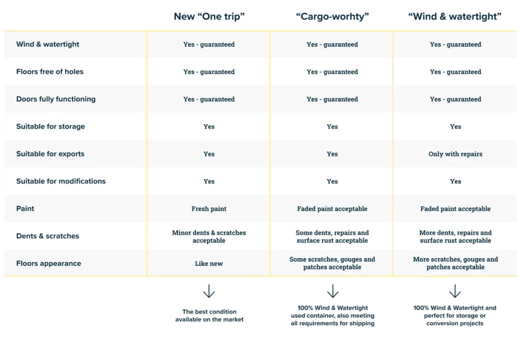 Another important step in how to buy shipping containers is choosing the container grade. The container grade indicates the condition that the shipping container is in and will influence what you can use the container for.